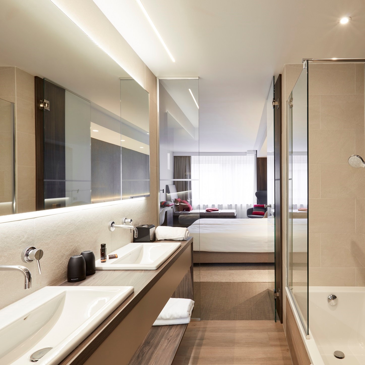 Bathroom with twin sinks, Here you don't have to choose between a bath or a walk-in shower, as both are provided.