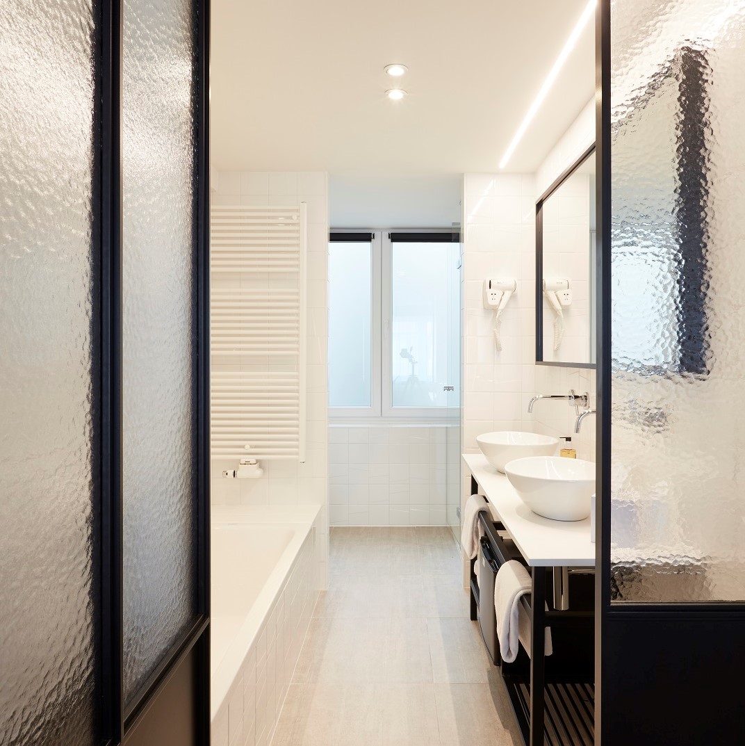 Salle-de-bain avec 2 lavabos, Ici, vous n'avez pas à choisir entre le bain ou la douche italienne, car les deux sont prévus